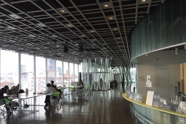 私が訪ねた晩は、図書館が20時で閉館した後も、最上階のフリースペースでは、椅子のないカウンターでは、多くの高校生たちが、バッグや部活動の用具を横に置いて立った姿勢のまま勉強に集中していた。