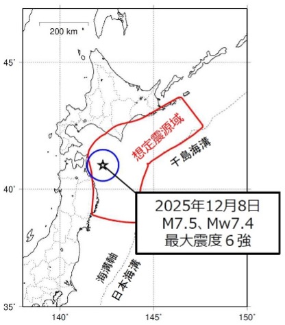 2025年12月8日23時15分頃青森県沖を震源とするM7.5の地震が発生し、青森県内で最大震度6強を記録した。この地震は太平洋プレートが日本列島の下に潜り込むプレート境界面で発生したいわゆるプレート境界型地震である。この地震を契機として、気象庁は「北海道・三陸沖後発地震注意情報」を発表した(文献1)。この地震情報は1週間を目途として継続され、12月16日0時に解除された。この情報は2022年12月に運用が開始されてはじめてのケースであるため、その意味内容はまだよく知られているとは言い難い。これとよく似た事例としては昨年8月に発生した日向灘地震の後に発令された南海トラフ地震臨時情報(巨大地震注意)がある。今回の注意情報はこの北日本版とも言えるものである。