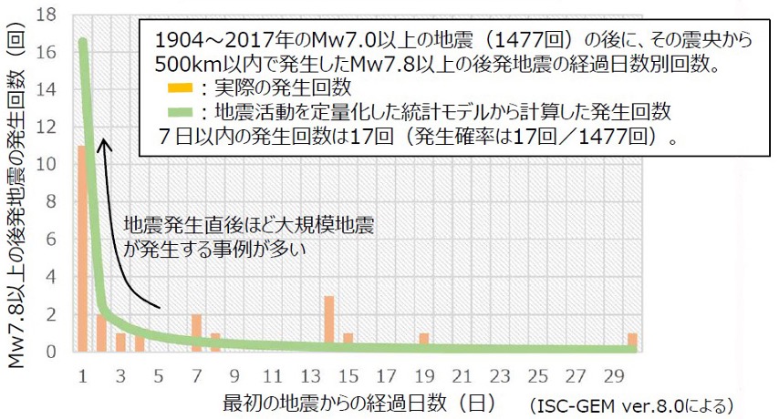 図3:Mw7.0以上の地震発生後にその震央から500㎞以内で発生した Mw8クラス以上(Mw7.8以上)の大規模地震。7日以内に発生するのは、百回に一回程度(文献1)。