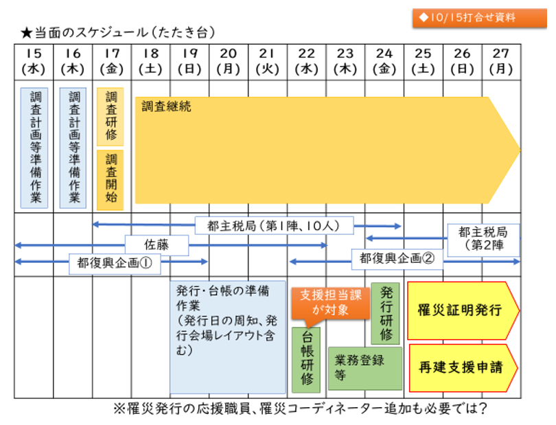 第1の点については、当面のスケジュール表(図-1)を作成して、業務の全体像を理解してもらうことに努めた。17日には被害認定調査の都応援職員(第1陣)が到着するので、調査の基本方針を速やかに決定し、研修の準備を進める必要がある。その他、罹災証明書の発行開始日、連動して必要となる各種支援策の受付準備の状況、などなど2日間で対応すべき課題は山積していた。